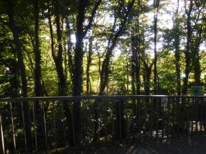 Auch das ist Mauritz-Ost: Die abendliche Sonne bricht durchs Grün. Blick von der Fußgängerbrücke über die Umgehungsstraße am Ende der Manfred-von-Richthofen-Straße in Richtung der Kleingartenanlage Morgensonne Post eV.