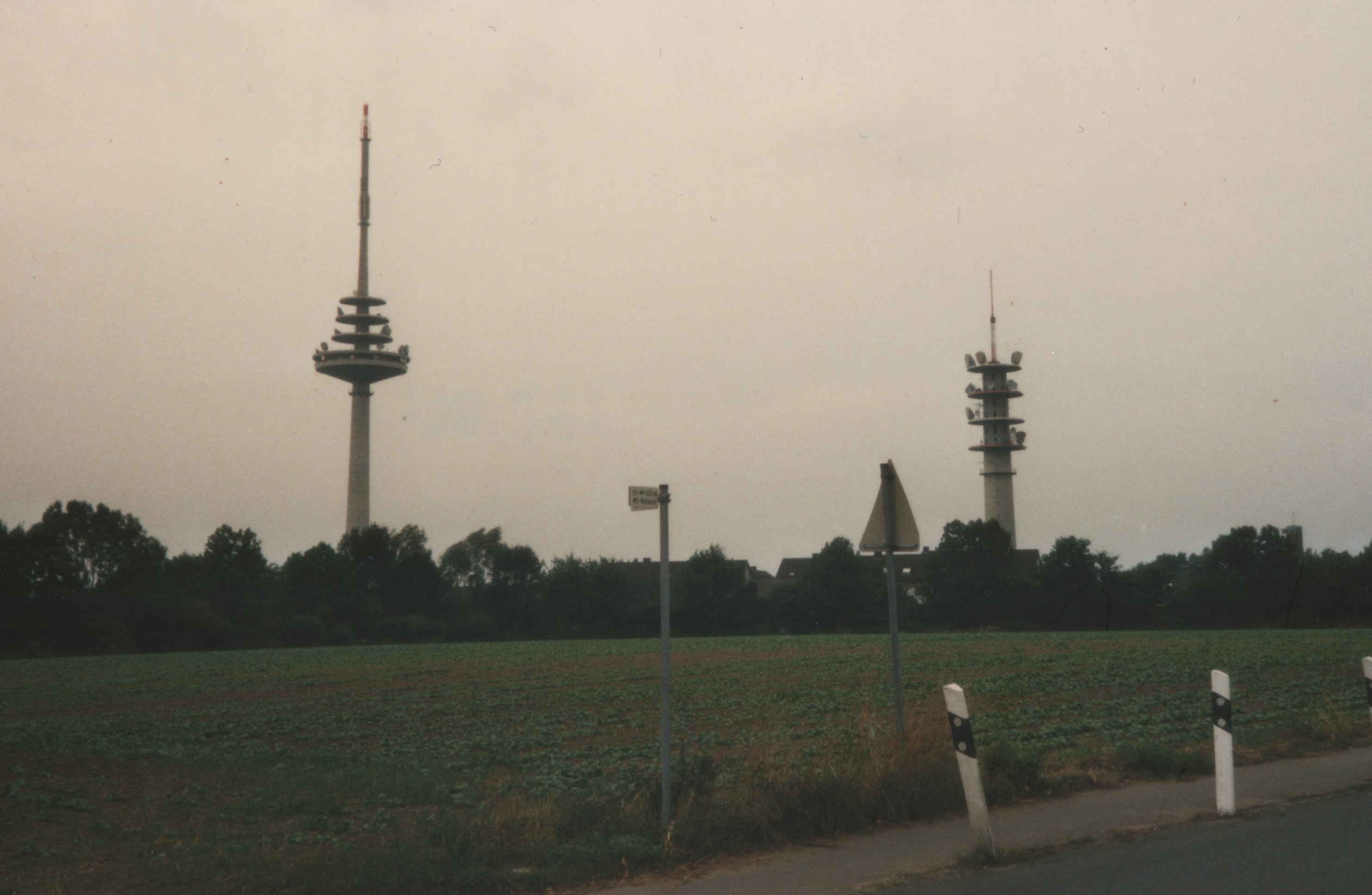 Links aktueller Fernmeldeturm, rechts der 1961 errichtete alte. Aufgenommen von Südende der Schmittingheide, Höhe Hunebach, Karnevalsmuseum im Jahr 1989.