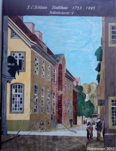 Hollenbeckerstraße 9. Wohnhaus Schlaun von 1753 (links), Wandgemälde von W. Schlüter (1995 nach Ludwig Scharf ~1920)